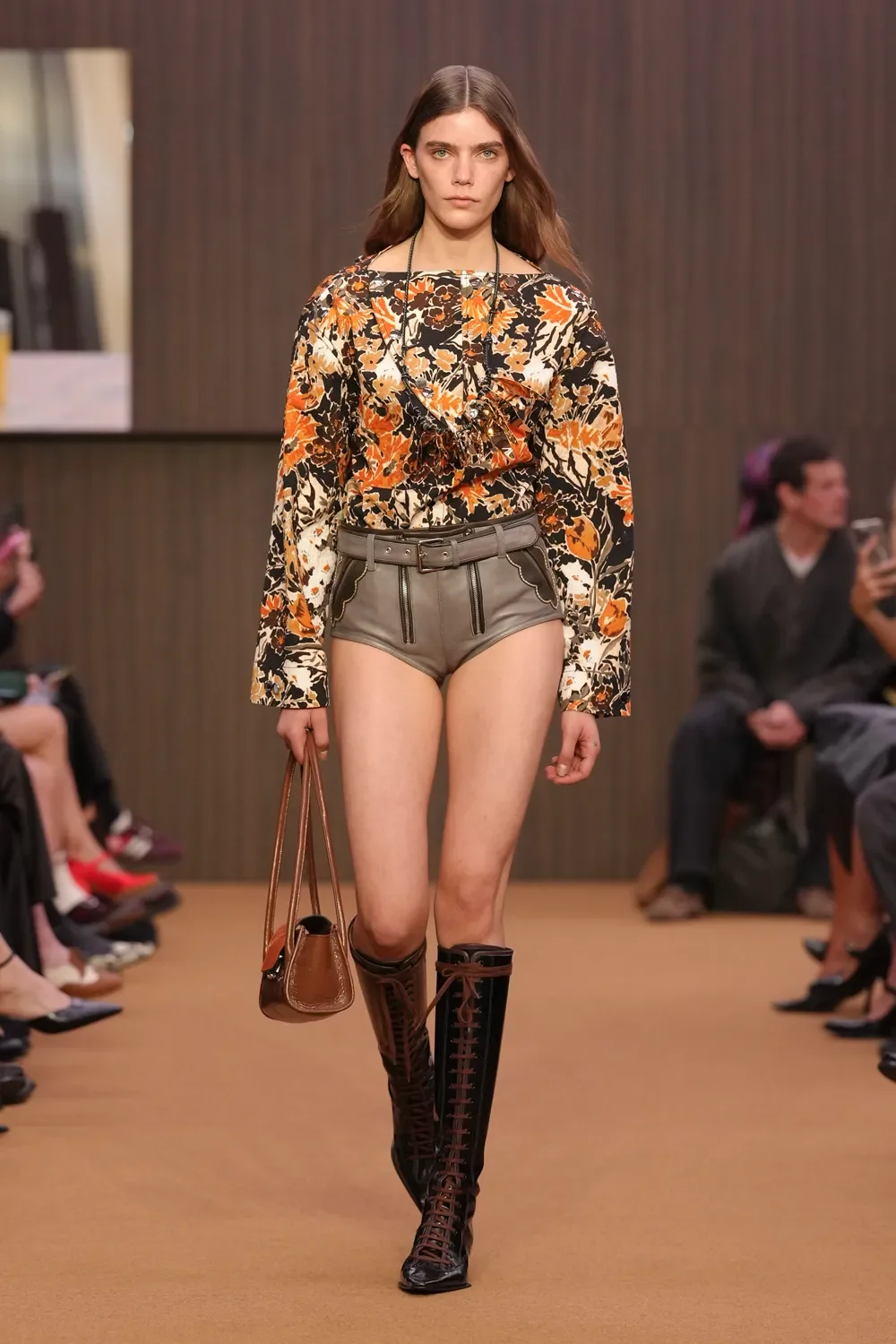 Underneath, a white shirt with every sequin glinting under the lights, a pair of mahogany leather loafers, and a sculptural, oversized statement bag tipping into costume. There was no forced drama. Just tension, the good kind. The kind that makes you lean forward.