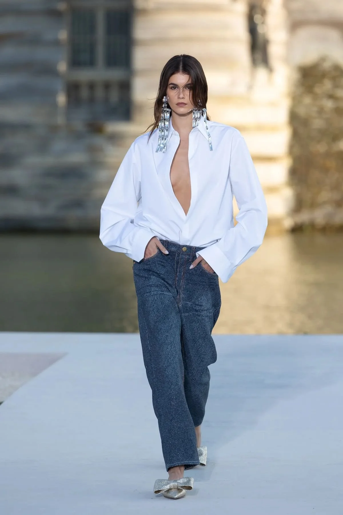 While it might seem too simple for fashion’s most extravagant stages, this humble outfit formula has had its moments in the spotlight. Major fashion houses have referenced it not just once but repeatedly. At the Valentino haute couture show, Kaia Gerber opened in jeans and a white shirt instead of a traditional lavish gown. A bold editorial choice that reaffirmed the beauty of understatement.